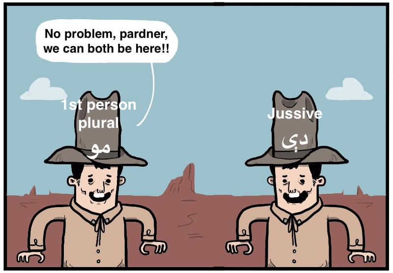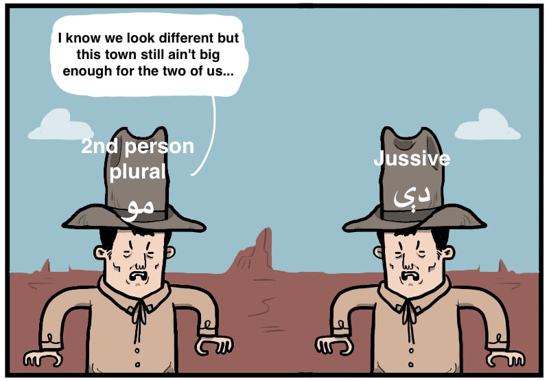 - Exception: when there's a conflict with another 2nd pers mini pronoun like دې - de, we leave out the jussive دې - de marker and instead use the 2nd person imperative form.